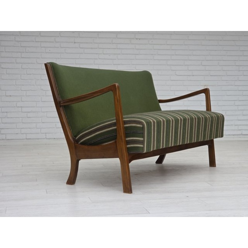 1960s, Danish 2-seater sofa. Original green furniture wool fabric, beech wood, springs in the seat. Original very good condition: no smells, no stains and stable construction. Manufactured by Danish furniture maker in about 1960-65s. Original Scandinavian vintage design directly from Denmark. The sofa was checked by craftsman.