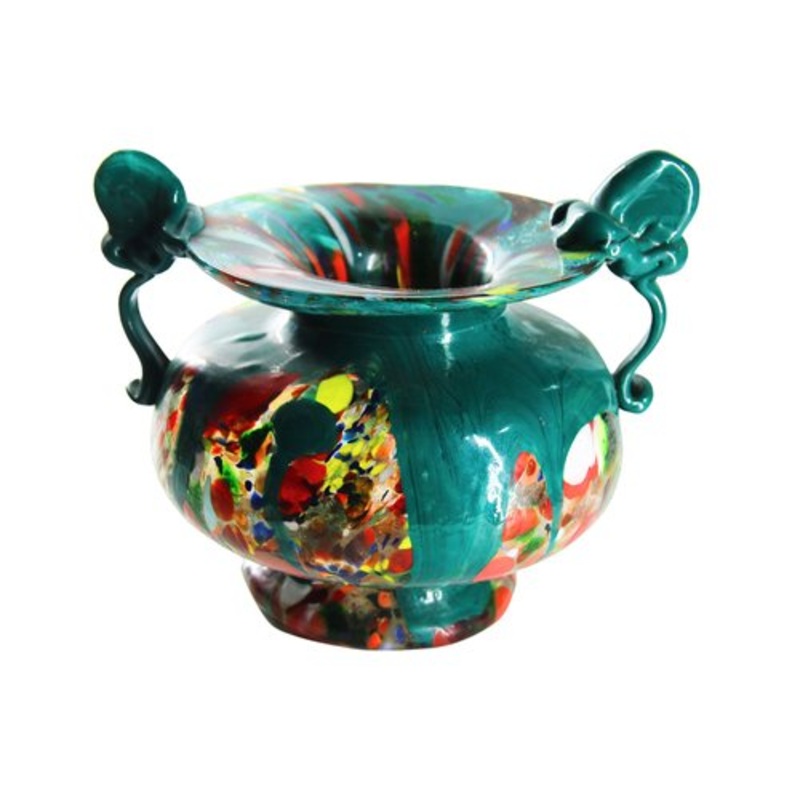 This handcrafted amphora vase, made from authentic Murano glass on the island of Murano, features a bold, abstract design with vibrant multicolors and a rich amethyst green hue spilling over the surface. The dynamic blend of colors and the fluid, unexpected flow create a striking visual impact, offering a funky yet refined aesthetic. with its unique style and exceptional Murano craftsmanship, this vase adds an artistic and luxurious touch to any space.