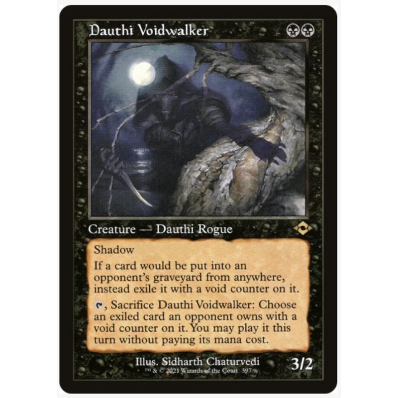 ShadowIf a card would be put into an opponent's graveyard from anywhere, instead exile it with a void counter on it.T, Sacrifice Dauthi Voidwalker: Choose an exiled card an opponent owns with a void counter on it. You may play it this turn without paying i