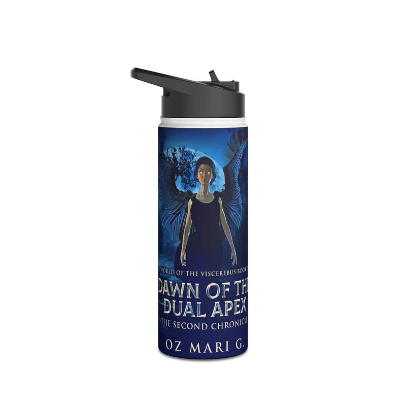 Quench your thirst in style with this 18oz stainless steel water bottle featuring a double-wall stainless steel build that keeps your drinks frosty for 24h and soothingly hot for 12h. This BPA-free, steel water bottle comes with a twist-on lid for easy sipping, making it excellent for daily use at work, at college, in the car, and beyond. The cover art in this water bottle is from Oz Mari G.’s book, Dawn Of The Dual Apex.
