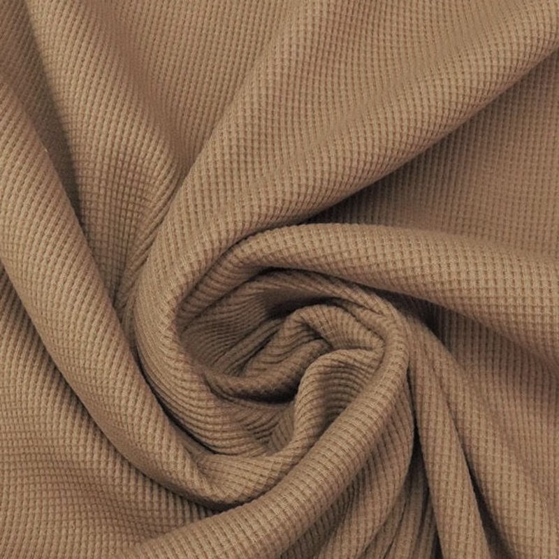 Cozy cotton thermal, designer deadstock, in cookie tan.100% cotton, 62" wide, mechanical stretchPrice per full yard is $12.00Price listed is per quarter yard (9" linear), please order in multiples for desired total yardage (example: for 1/2 yard enter "2"