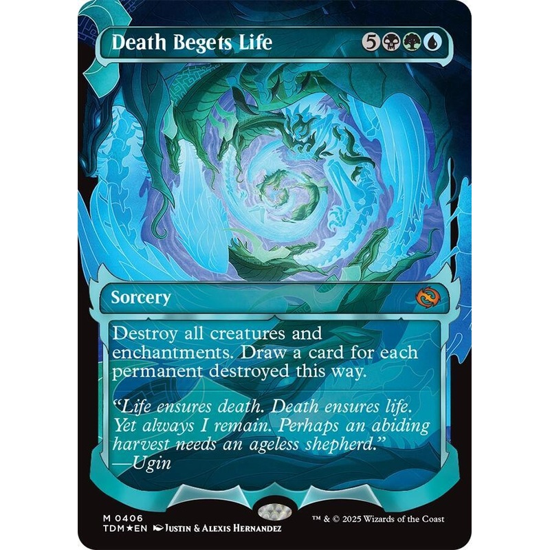 Destroy all creatures and enchantments.Draw a card for each permanent destroyed this way.Rarity:M#:406Card Type:SorceryFlavor:"Life ensures death. Death ensures life. Yet always I remain. Perhaps an abiding harvest needs an ageless shepherd.UginCasting Cos