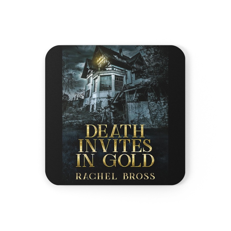 These coasters are made with a high-gloss top and feature a cork back to prevent sliding, and each order comes with a set of four coasters. The cover art in these coasters is from Rachel Bross's book, Death Invites In Gold.