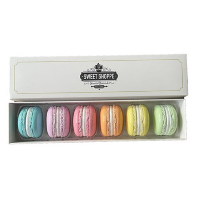 Your Christmas tree is sure to be the sweetest around this holiday season with this set! It features a pink, purple, blue, orange, yellow, and green macaron cookie with white icing sandwiched in the center! Hang them throughout your tree, in a wreath, garland, or fill an apothecary jar!Sold as a set of 6.Made by December Diamonds.Made of resin.