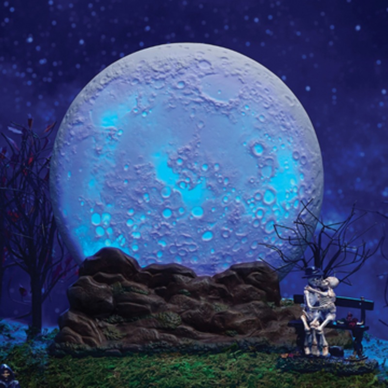 Give your Halloween village the spookiest background with this stunning accessory! It features a large white full moon with craters as it rises up over a cliffside! You can use the remote features to change it to an array of different colors to match your