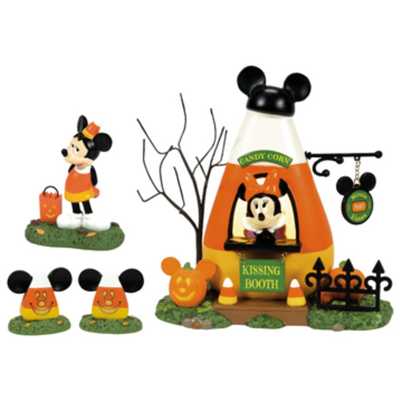 NEW for 2024 Add these NEW for 2024 pieces into your Mickey's Pumpkintown village! It features a happy little Minnie manning her kissing booth, a bashful Mickey with ticket in hand trying to muster up the courage, and a pair of candy corn Mickey Mouse topi