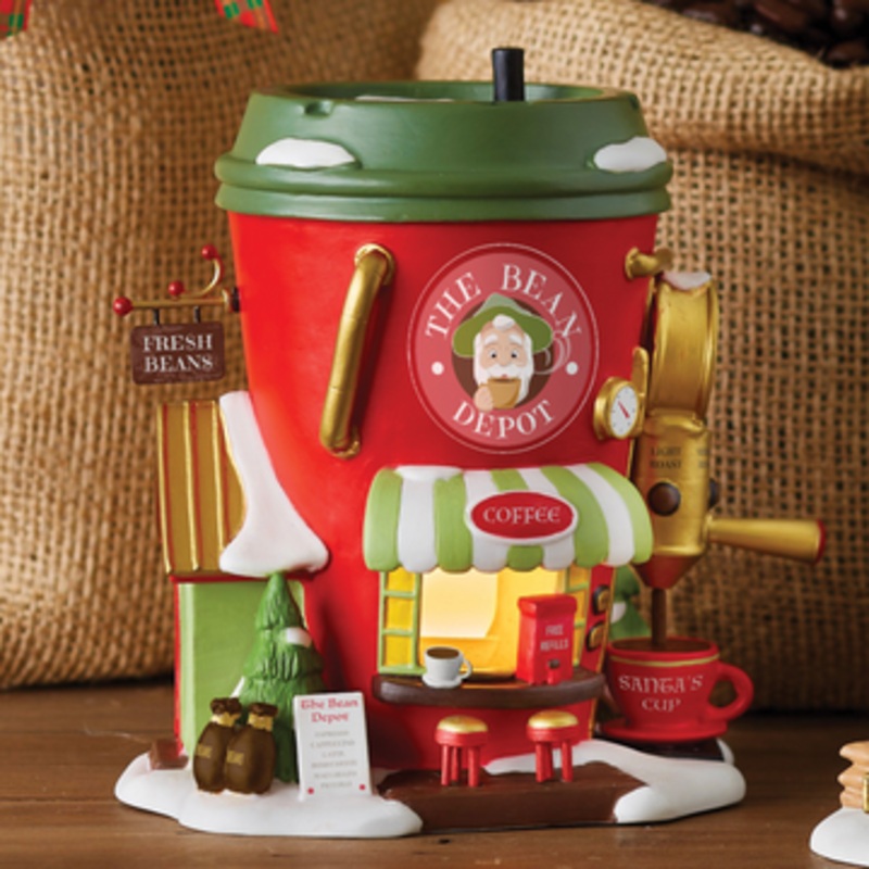Those hard workingelves need a pick me up every now and again whilst building toys for all the good boys and girls! This features a red building shaped like a coffee cup and a green lidded roof with a green and white striped awning below a large Bean Depot logo with a Santa face sipping a cup of joe! A twisting of golden pipes stick out of the buildingthat resemble giant espressomachine parts. On one side of the building a large red cup and saucer sits with “Santa’s Cup” written on it and a stream of fresh brewed coffee dripping down! A small coffee bar sits under the awning with a menu and a few stools. Pairs with The Daily Grind 6014510 Sold Separately.Introduced October 2023.Made by Department 56.Made of porcelain.Dimensions:5.5in H x 3.9in W x 4.9in L.Item #: 6014509