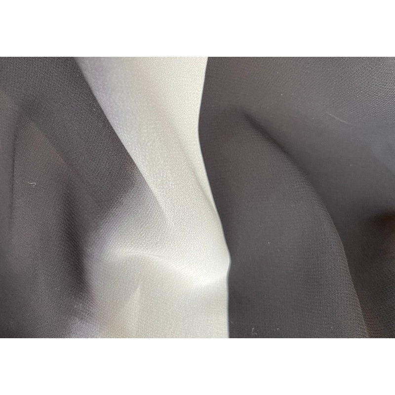 A designer polyester georgette of lengthwise black and silk white stripes, consisting of a2 wide, feathered edgesilk white stripes surrounded by 8 1/2″ wide soft black stripes – perfect for blouses, exquisite tops, or pleated skirts. Used by a high-end American designer.100% polyester. 58″ wide.