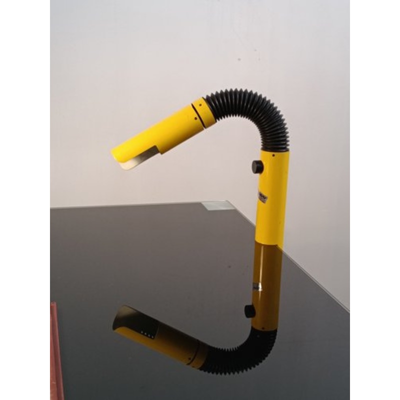 Flexible tubular structure in yellow lacquered metal. The reflector pivots on its axis, openings on the top let the heat from the bulb pass through. The switch is on the bottom.