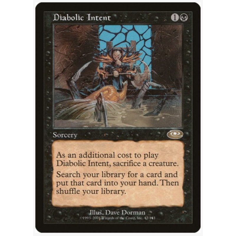 As an additional cost to play Diabolic Intent, sacrifice a creature.Search your library for a card and put that card into your hand. Then shuffle your library.Rarity:R#:42Card Type:SorceryCasting Cost: 1B