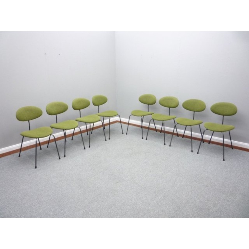 Rare chairs by Hans Bellmann.They come from the first owner and were used in a church.The fabric cover was renewed a few years ago and looks very good.The metal frames have paint defects and signs of wear.All 8 chairs are stable and very comfortable.They a