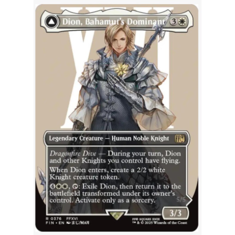 Dragonfire Dive During your turn, Dion and other Knights you control have flying.When Dion enters, create a 2/2 white Knight creature token.4WW, T: Exile Dion, then return it to the battlefield transformed under its owner's control. Activate only as a sorc