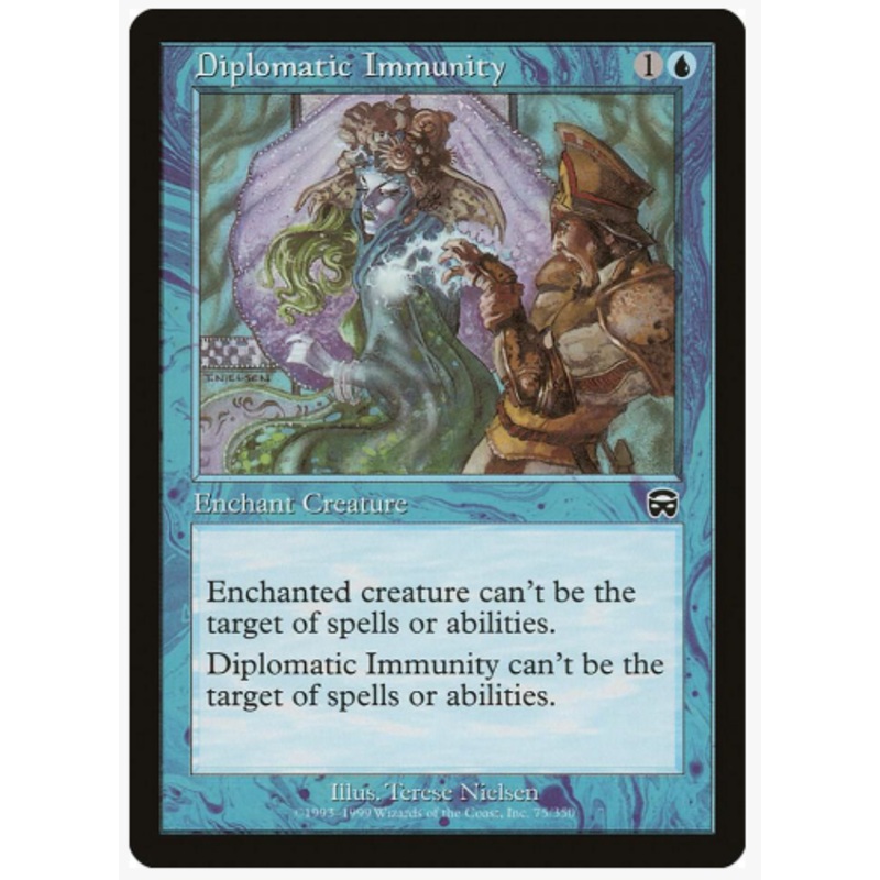 Enchanted creature cant be the target of spells or abilities.Diplomatic Immunity cant be the target of spells or abilities.Rarity:C#:75Card Type:Enchant CreatureCasting Cost: 1U