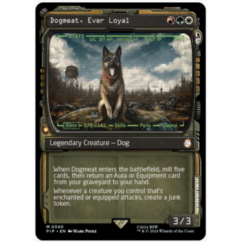 When Dogmeat enters the battlefield, mill five cards, then return an Aura or Equipment card from your graveyard to your hand.Whenever a creature you control that's enchanted or equipped attacks, create a Junk token.Rarity:M#:340Card Type:Legendary Creature