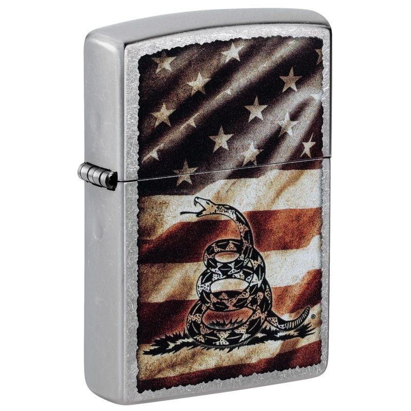 The iconic Dont Tread On Me rattlesnake appears over a waving flag on this classic Street Chrome lighter in a patriotic Color Image design. Comes packaged in a gift box. For optimal performance fill with Zippo lighter fuel. Genuine Zippo windproof lighter
