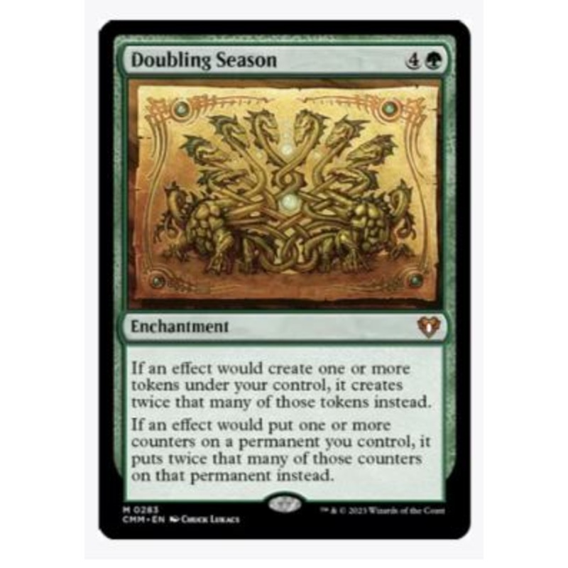 If an effect would create one or more tokens under your control, it creates twice that many of those tokens instead.If an effect would put one or more counters on a permanent you control, it puts twice that many of those counters on that permanent instead.