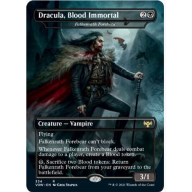 FlyingFalkenrath Forebear can't block.Whenever Falkenrath Forebear deals combat damage to a player, create a Blood token.B, Sacrifice two Blood tokens: Return Falkenrath Forebear from your graveyard to the battlefield.Rarity:R#:334Card Type:Creature Vampir