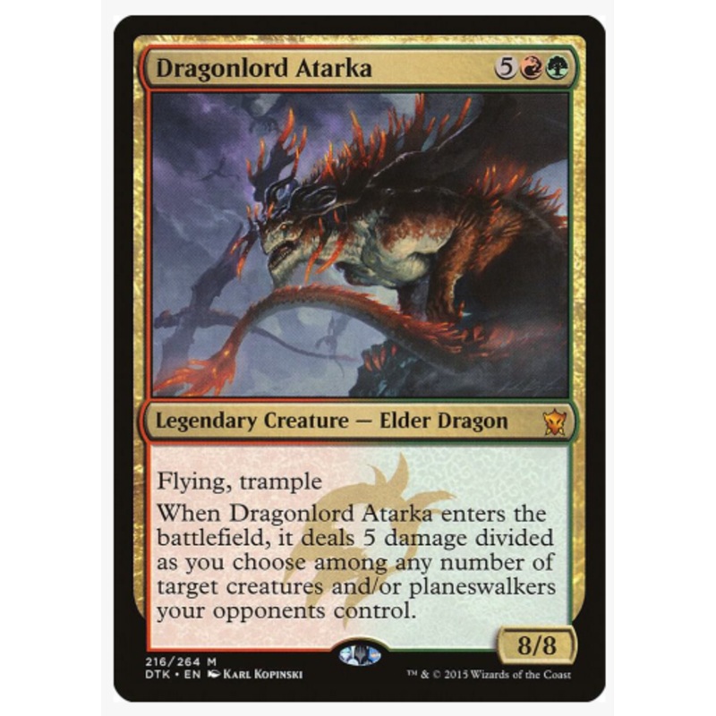 Flying, trampleWhen Dragonlord Atarka enters he battlefield, it deals 5 damage divided as you choose among any number of target creatures and/or planeswalkers your opponents control.Rarity:M#:216Card Type:Legendary Creature Elder DragonP / T:8 / 8