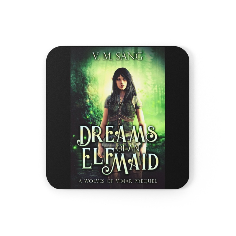 These coasters are made with a high-gloss top and feature a cork back to prevent sliding, and each order comes with a set of four coasters. The cover art in these coasters is from V.M. Sang’s book, Dreams Of An Elf Maid.