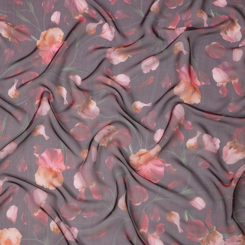 Dusty Mauve Base Coral and Peach Iris Floral Printed Pure Silk Chiffon Fabric, 110 Cms Width, Made in South Korea-D24005