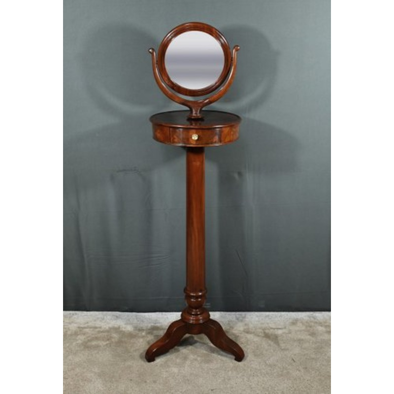 This solid mahogany barber table, dating from the Restoration period at the beginning of the 19th century, is an elegant and refined piece of furniture. It consists of a round tilting mirror, framed by a curved wooden structure resting on a circular base with basin top and drawer with chiseled brass handle. The cylindrical shaft rests on a tripod base sculpted with moving feet, ensuring the stability of the piece of furniture. This piece of furniture is typical of the Restoration period, characterized by a return to classic forms and the use of noble materials such as mahogany.