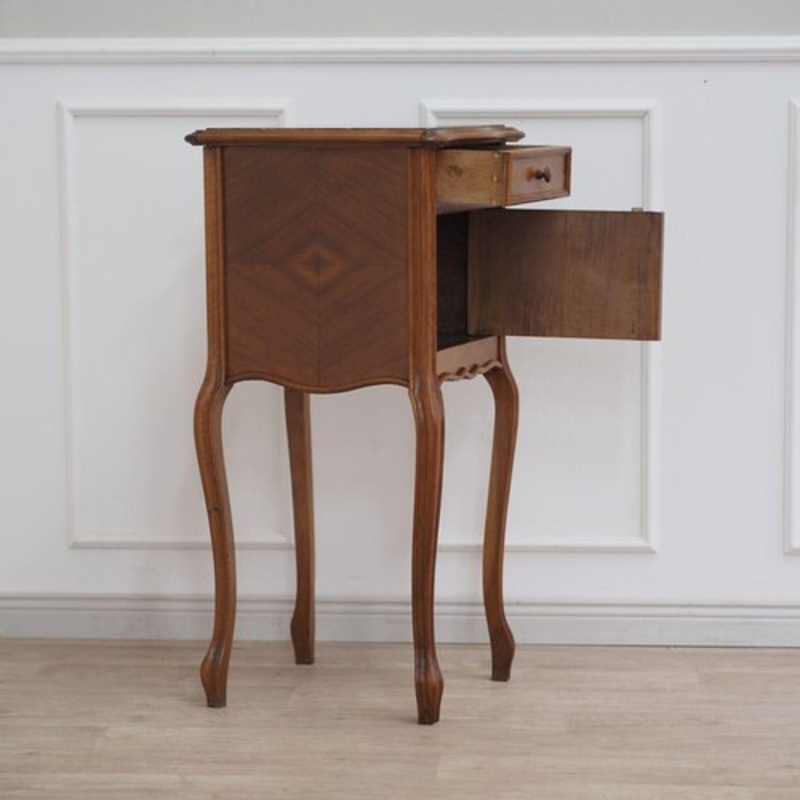 This elegant antique bedside table impresses with its curved design and its elegant veneer appearance. The original red and white marble top gives it a stylish character and makes it a special eye-catcher. The drawer above and the door compartment provide