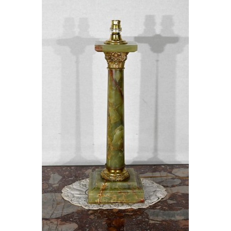 Lampe de style Empire comportant un long ft cylindrique en onyx vert au veinage bordeaux subtil.Ce corps est enchss dans une collerette figurant une guirlande de lauriers. En partie haute un lment sculpt forme le haut dune colonne inspire de la Grce antiqu