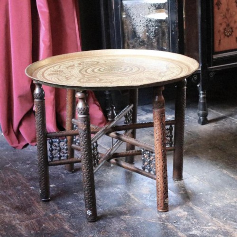 A very nice C.1920 fordable table from India. The brass top highly engraved with lions and plant design, the legs well engraved and with inlay. 46cm / 18" tall x 60cm / 23.5" diameter Design Period 1920 to 1949 Production Period Unknown Country of Manufact