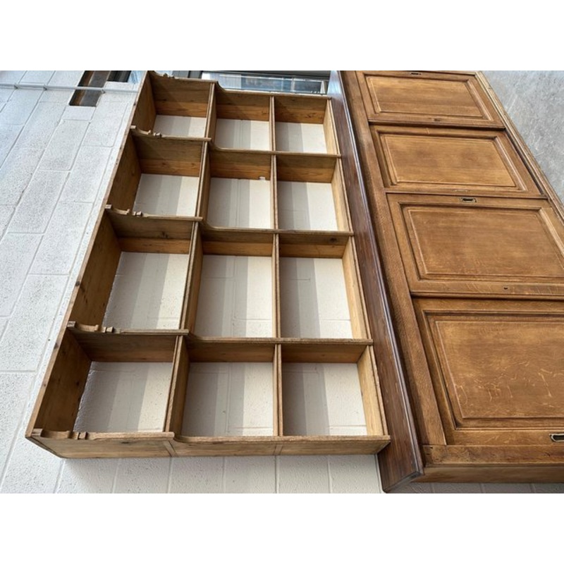 This oak and fir shelf has been completely restored. It can be fixed to the wall or placed on a piece of furniture, it has 12 compartments. Can be used as a dresser, decorative shelf, bookcase, etc. 4-door sideboard sold separately.