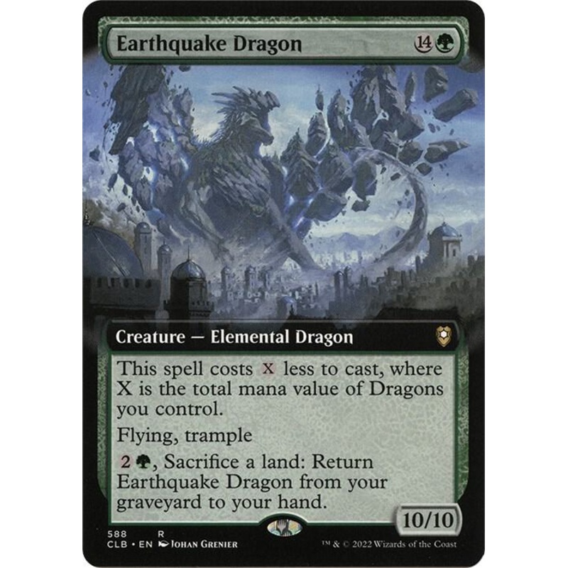 This spell costs X less to cast, where X is the total mana value of Dragons you control.Flying, trample2G, Sacrifice a land: Return Earthquake Dragon from your graveyard to your hand.Rarity:R#:228Card Type:Creature Elemental DragonP / T:10 / 10Casting Cost
