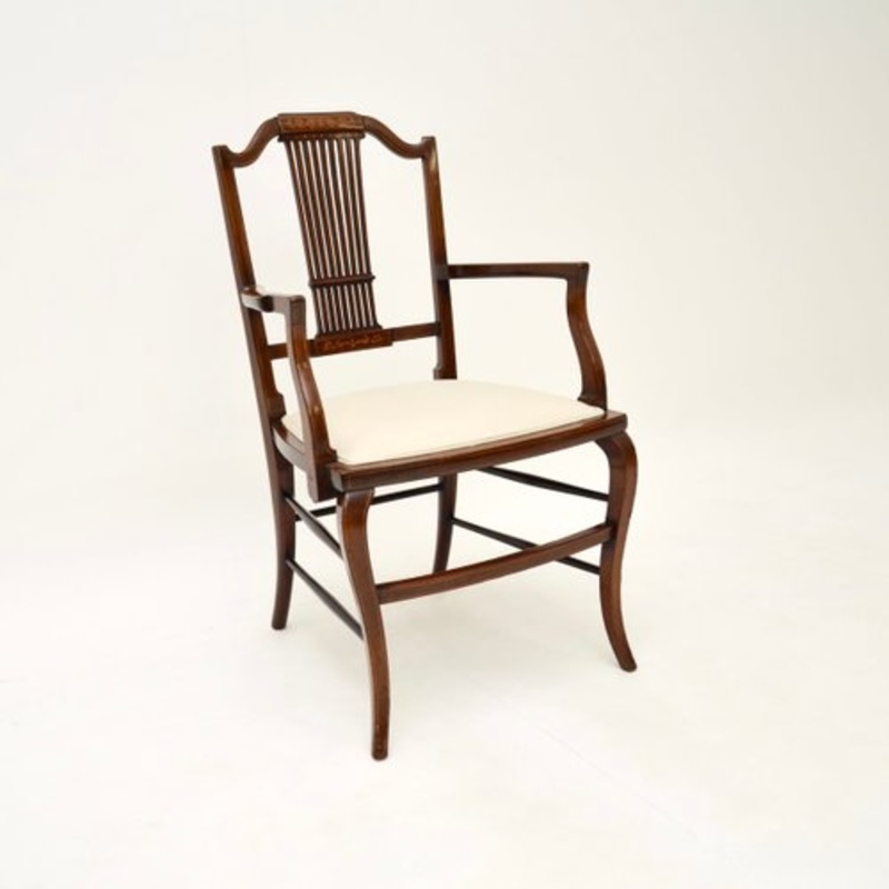 A beautiful and elegant antique Edwardian armchair. This was made in England, it dates from around 1900-1910 period.It is of excellent quality and is very well made. The frame has lots of stunning satinwood inlay on the back rest, arms and legs. Its also s