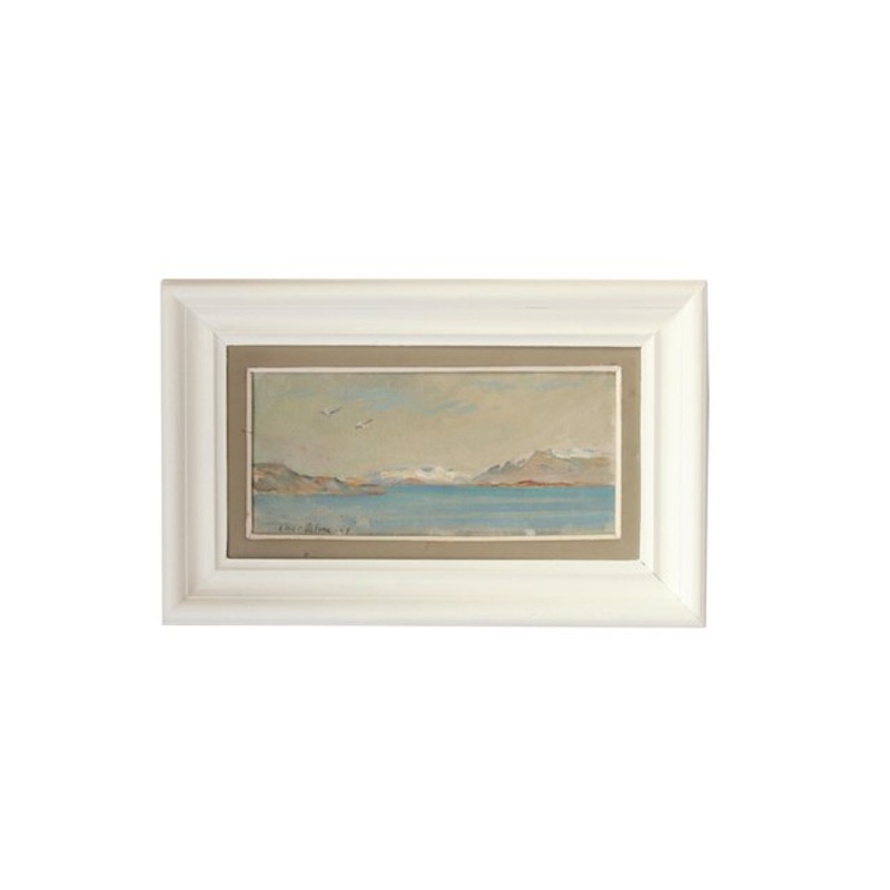 : Very beautiful Swedish oil painting by Einar Palme from 1948. The artwork shows a hilly landscape on the water with seagulls in beautiful blue tones. The work is signed. This painting is framed in a wooden frame which is lacquered white and has dimensions of 45 cm wide and 29 cm high.