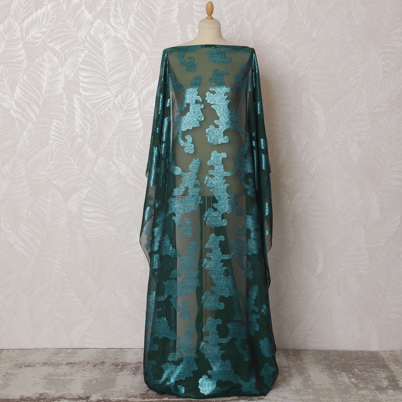 This exquisite pure silk chiffon fabric features an elegant emerald green base adorned with a striking teal floral pattern, creating a luxurious and sophisticated look. Measuring 140 cm in width and extending to 3.5 meters in length, this traditional Somali Dirac fabric offers ample material for crafting stunning garments. The rich emerald green hue beautifully complements the shimmering teal floral design, making it ideal for special occasions and high-fashion pieces. The lightweight and breathable nature of chiffon ensures comfort while maintaining an elegant appearance. Made in France, this fabric epitomizes exceptional quality and unique design, making it a perfect choice for those who appreciate elegance and distinction. Elevate your wardrobe with this exquisite fabric and enjoy the timeless beauty it brings to your creations.