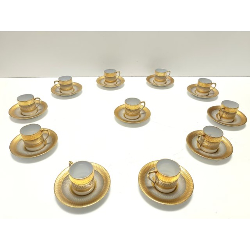 Made in Germany, 1960s.This set features 11 coffee cups and 11 plates. The coffee cups are made in fine and light porcelain, which is decorated with pure gold.They are made by Hutschenreuther Hohenberg,an important porcelain company that becomes part of th