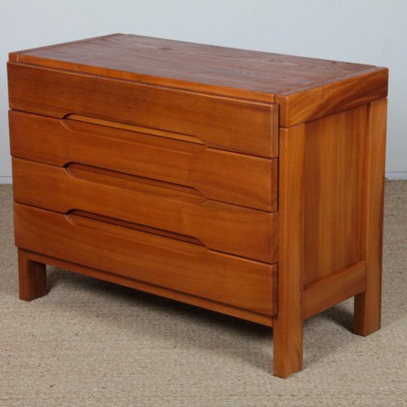 This solid elm chest of drawers was produced by Maison Regain in the 1970s. It opens using a series of four drawers on the front. This piece of furniture is in good vintage condition. Manufacturer Maison Regain Design Period 1970 to 1979 Production Period