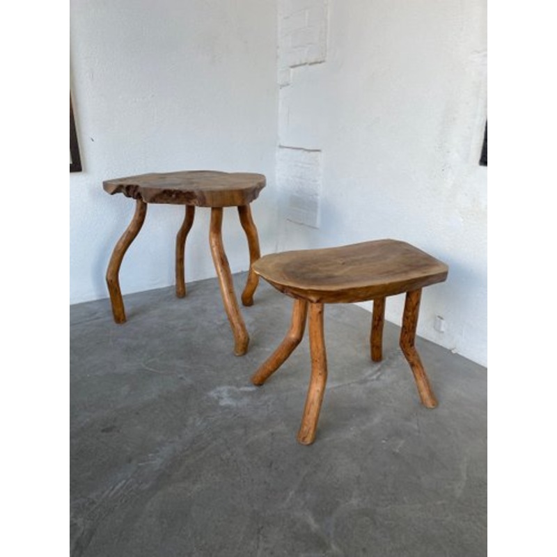 Old pair of small side tables or stools and high stool in solid elm.Totally unique, with their unique shapes.We like their thick seats, the grain and the color of the wood.Very elegant at the ends of sofas, small bedside tables Original patina.-Dimensions