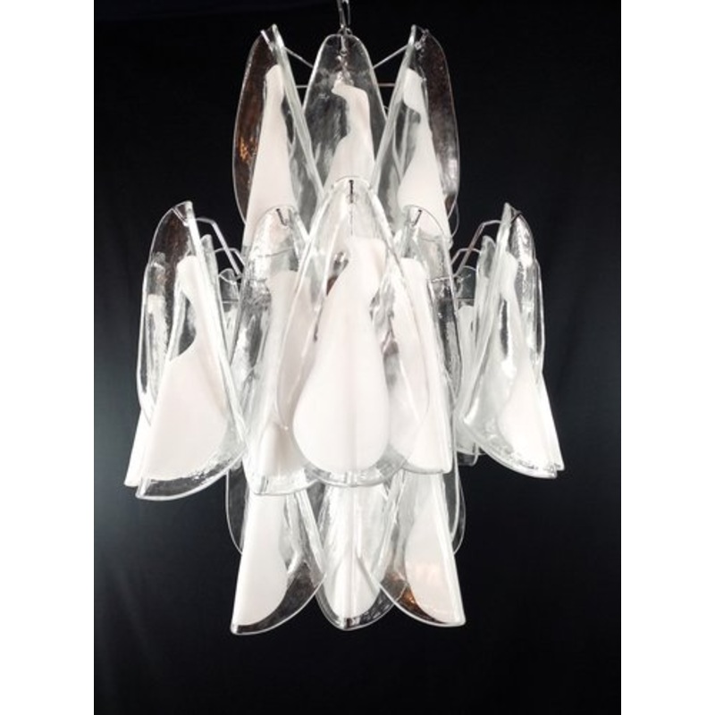 Vintage Murano chandelier, Mazzega style. Empire style with multiple floors of glass, lots of filler. with no. 32 Murano glasses, handmade, reminiscent of the shape of the Swallow, crystal with a milky white core. This chandelier has very special light ref