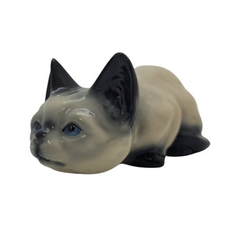 Charming cat-shaped figure made of Spanish porcelain during the 20th century, probably from the Valencian area, following Lladr. The Siamese cat is lying down, with its four paws tucked under its body. His open eyes and ears reveal an alert attitude. The enamelled finish adds shine and softness to the piece. No seal.