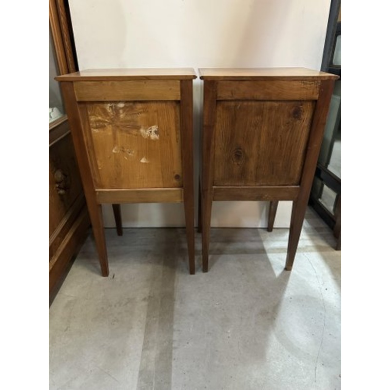 Pair of Direttorio bedside tables from the 1700s in Louis XVI style. In cherry wood, rectangular top, compartment with shelf and door, small drawer with brass knob. Four long quadrilateral legs, which narrow on the part that touches the floor. In excellent