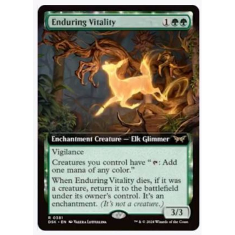 VigilanceCreatures you control have "T: Add one mana of any color."When Enduring Vitality dies, if it was a creature, return it to the battlefield under it owner's contorl. It's an enchantment.(It't not a creature.)Rarity:R#:381Card Type:Enchantment Creatu