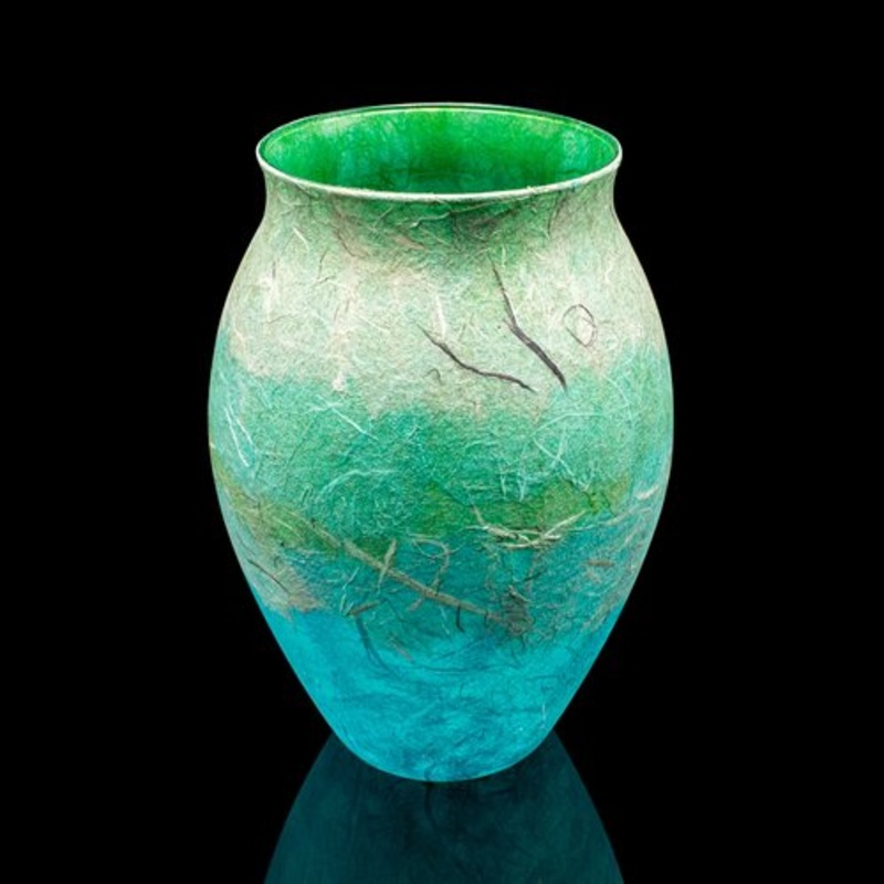 This is a contemporary display vase. An English, art glass and straw silk finish flower urn by Margaret Johnson, dating to the turn of the millennium.Eye-catching sea-inspired hues with a distinctive decorative finishDisplays a desirable, contemporary appe