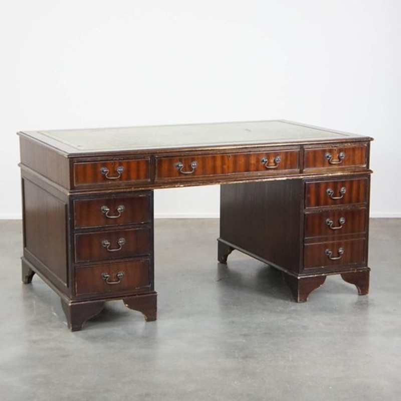 This characteristic English style chesterfield desk with green leather top and a fantastic patina. This beautiful Chesterfield desk has a characteristic and expressive appearance. He is a true eye-catcher and a fantastic asset for the enthusiast. It has 4 drawers on the left and right and a large drawer under the top to store your things. Through years of use it has suffered signs of wear and acquired a fantastic patina, see photos. Structurally it is in immediately usable condition. with appropriate use and maintenance, you can enjoy this fine desk for many years to come. Dimensions: Height: 79 cm Width: 153 cm Depth: 91 cm Knee leg height: 60 cm