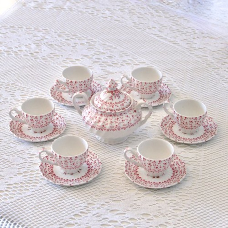 Wonderful old English porcelain coffee service, stamped Johnson Bros Rose Bouquet collection. Adorable plant decoration of rose buds delicately engraved by hand (hand engraving on the stamp). Porcelain in fluted fretwork relief. Service consisting of: 6 co