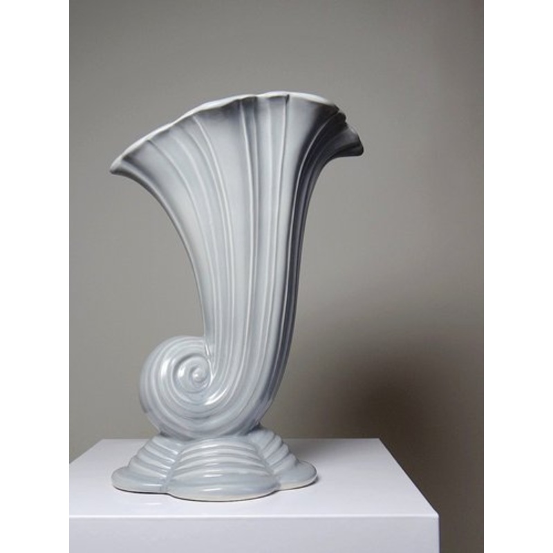 Very beautiful vintage Aegean earthenware vase Made In England, from Royal Winton, Aegean being the name of the “Aegean” model, vintage, 1950s, art deco style, depicting a shell, a wave or a cornucopia with a wide neck. Beautiful blue-gray enameled material, an unusual model in this coloring which gives it a more modern and Shabby chic style. Large model, 27cm maximum height, approximately 17cm maximum width, 6-7cm maximum diameter, 13cm maximum diameter at the base. Very good general condition, nothing notable. Around 800gr-1kg.