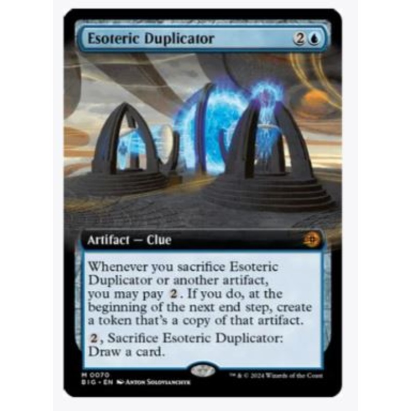 Whenever you sacrifice Esoteric Duplicator or another artifact, you may pay 2. If you do, at the beginning of the next end step, create a token that's a copy of that artifact.2, Sacrifice Esoteric Duplicator: Draw a card.Rarity:M#:70Card Type:Artifact Clue