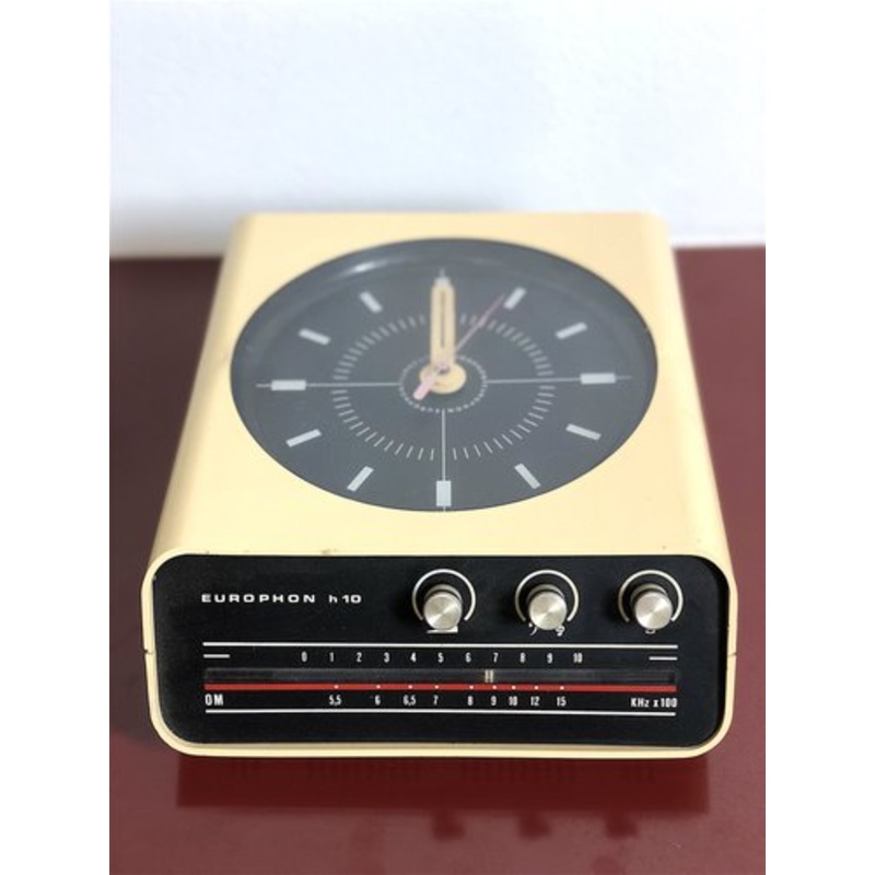 Radio Clock Europhon h10 60's - 1st edition.Design ADRIANO RAMPOLDI Material Plastic ABS White, possibility to hang or lean it. Working, missing the back closure, comes with power cord Dimensions: L.23 x D.9 x H.31 cm Creator ADRIANO RAMPOLDI Manufacturer