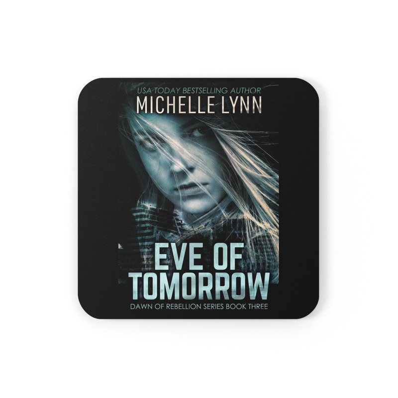 These coasters are made with a high-gloss top and feature a cork back to prevent sliding, and each order comes with a set of four coasters. The cover art in these coasters is from Michelle Lynn’s book, Eve of Tomorrow.