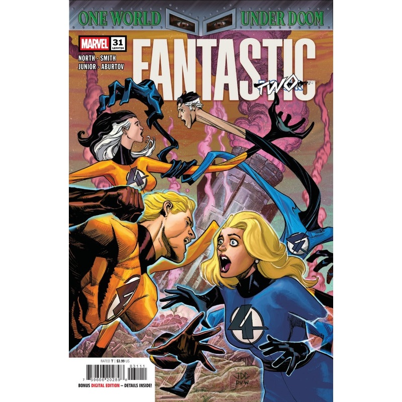 FANTASTIC TWO! As Ben recovers from what Doom has done to him, the Fantastic Four learn they’re losing their powers at the one time they need them the most desperately! If they can’t reverse the effect, they may be lost forever and Doom will be unstoppable. But the family has an idea of how to get them back and to do it safely. They need only recreate the circumstances that first gave them their powers. But when safety doesn’t get them results, there is a more desperate path available to the Four and they take it. It all comes down to this! A young woman. Her kid brother. The man she loves. His only friend… and a desperate launch into space.