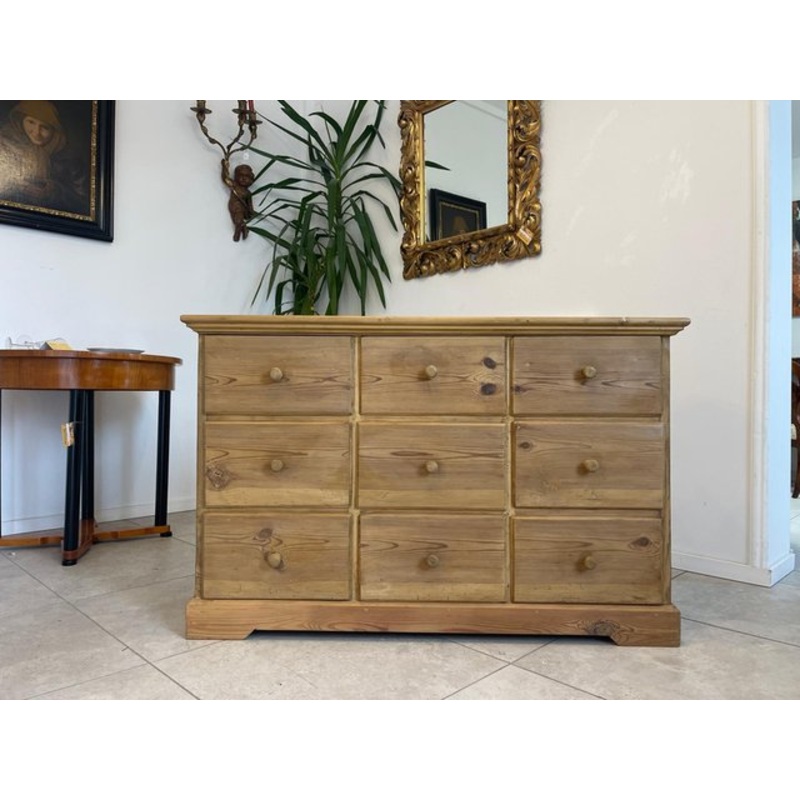 Rural elegant 9 shop chest of drawers, shop cabinet - pharmacy cabinet Dimensions: height x width x depth 84 x 129 x 33 For sale is a farmer's solid wood sideboard (spruce wood) from around 1900. This is a classic, elegant farmer's piece of furniture made