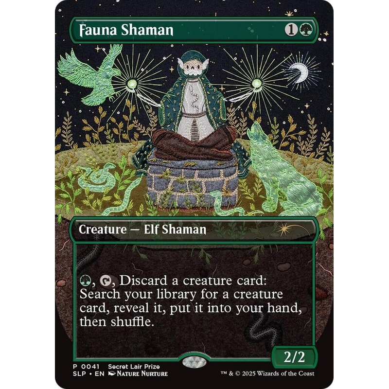G, T, Discard a creature card: Search your library for a creature card, reveal it, put it into your hand, then shuffle.Rarity:P#:41Card Type:Creature Elf ShamanP / T:2 / 2Casting Cost:1G